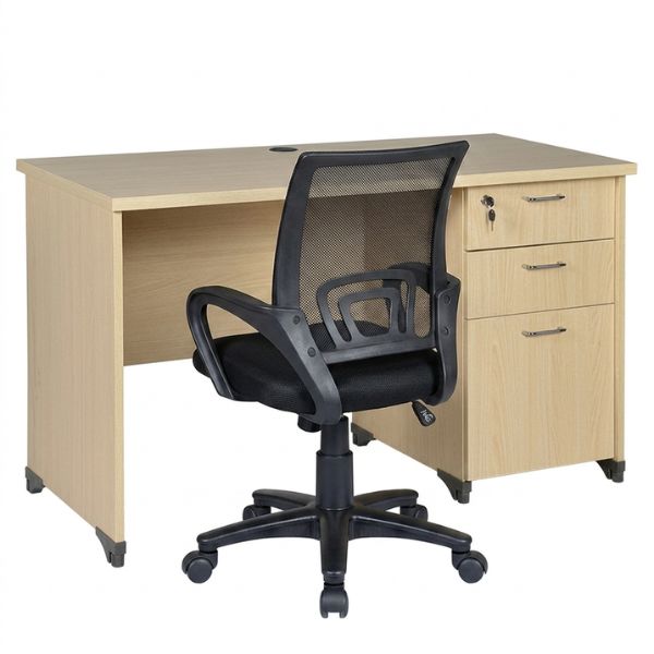 Bộ bàn ghế làm việc giá rẻ gồm bàn AT100SHL3D nhỏ gọn, 3 hộc tiện nghi và ghế lưới tiêu chuẩn GL113R chân nhựa. Combo bàn ghế siêu tinh gọn cho không gian văn phòng nhỏ hoặc tại nhà.